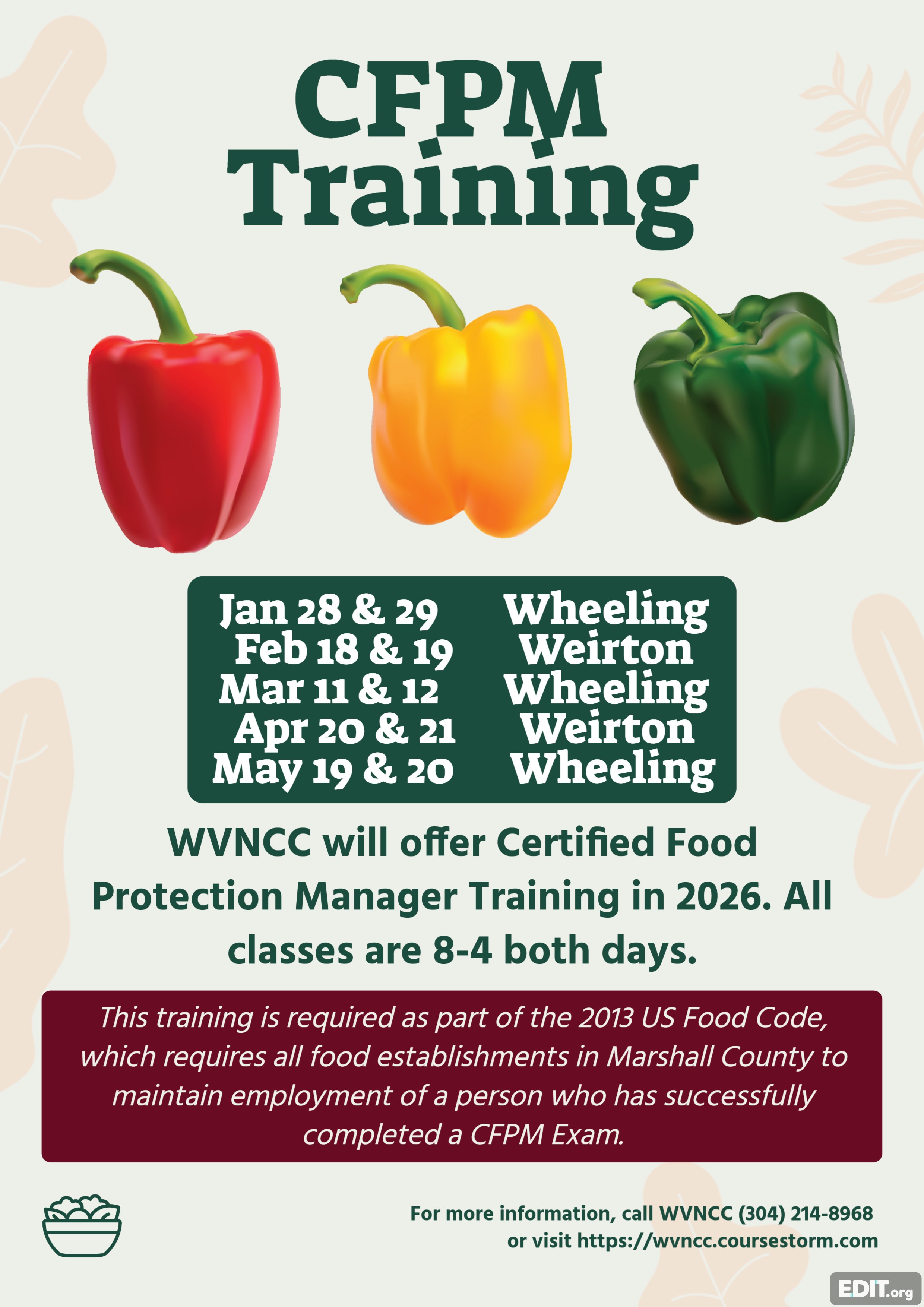 West Virginia currently uses the 2013 version of the FDA Food Code, and Marshall County conducts Risk-Based Inspections. With this method, inspections are focused on the five main risk factors involved in foodborne illness: